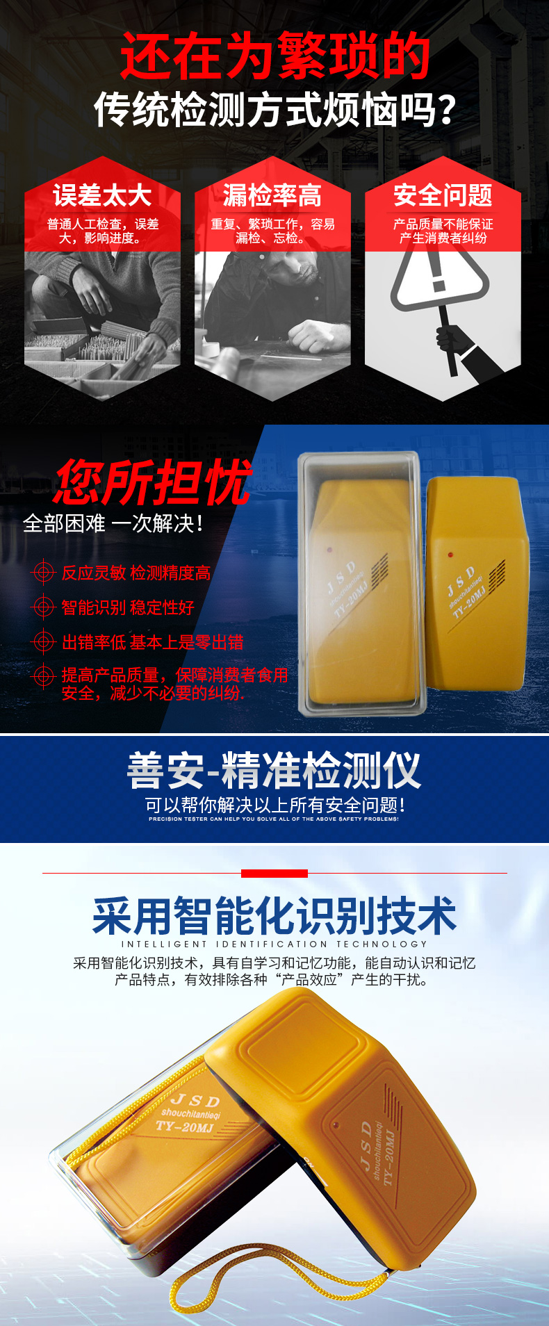 可对针织、衣料、袜、被服、皮革、鞋材等薄、小件制品进行断针探测,能迅速正确找到断落的铁针断头。可用于五金钮扣等服装服饰配件进行铁磁性杂质探查。可对人体、牲畜等工伤、刀伤、压伤等部位进行检查,检查其内部是否渗进有害铁屑物。还可用于边防关哨检查,公务人员对被检人员的暗藏工具的迅速搜查。